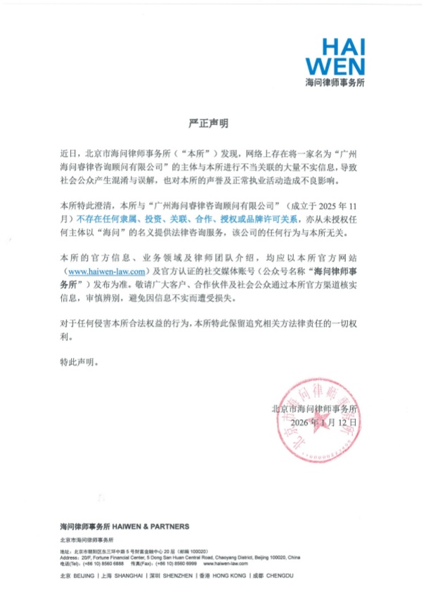 本所特此澄清,本所與“廣州海問睿律咨詢顧問有限公司”(成立于2025年11月)不存在任何隸屬、投資、關(guān)聯(lián)、合作、授權(quán)或品牌許可關(guān)系,亦從未授權(quán)任何主體以“海問”的名義提供法律咨詢服務(wù),該公司的任何行為與本所無關(guān)。更多詳情,請點擊左下方按鈕查看。